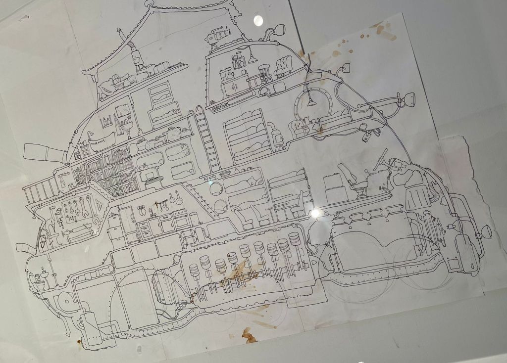 The exhibition itself is divided into two rooms in accordance with the two parts of the picturebook. With exhibit labels being close to none, and some quotes sprinkled around the framed drawings, the museum invites its visitors to enter a fantastical watercolour realm where hours can be spent looking at minuscule details of each piece. Over 80 full-size original drawings, in thin brown frames can be seen. In addition, models of the fantastic bus have been incorporated in the exhibit, including one made out of Lego (of course! It is Denmark after all).
