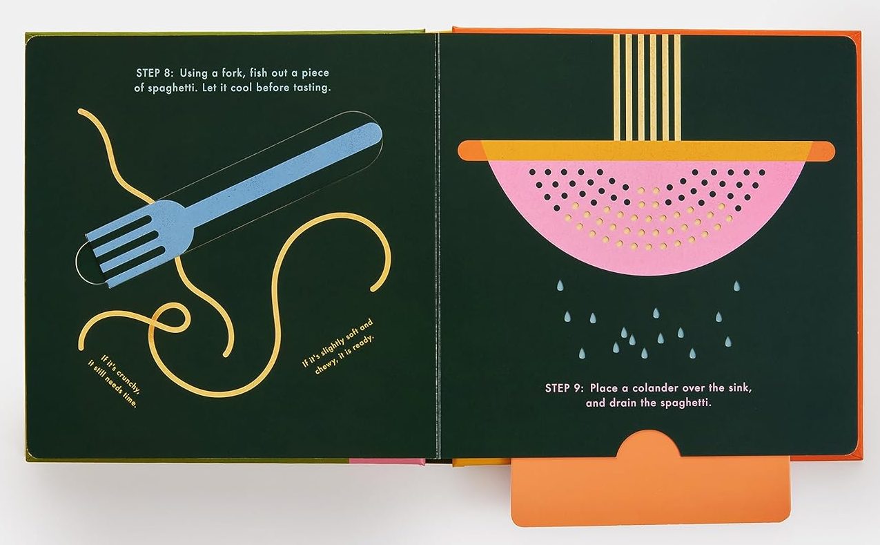 Children’s cookbooks can take on the form of a playful book-object in which interaction from its reader is key to building the narrative. Books with interactive affordances such as flaps to pull and doors to open can follow the process of creating a meal, inviting the child reader to participate in its preparation through print, as is seen in the images below corresponding to Spaghetti!: An Interactive Recipe Book (Nieminen, 2023). As a first encounter with the components of a recipe (ingredients, utensils and steps in the preparation), children can engage with and internalise the skills needed to then replicate this process in real-life, bringing play and cooking from the pages of the book to the kitchen table.