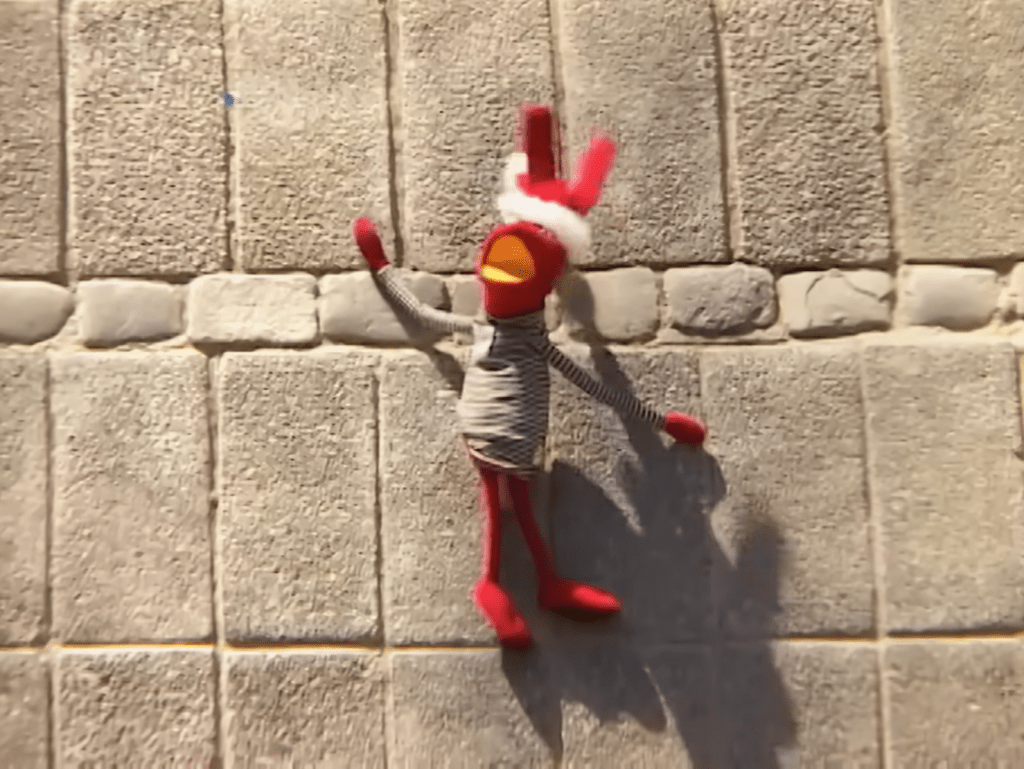 Juanín (the fluffiest member of the crew) shouts “¡y llegan los regalos!” (“and the presents arrive!”) as he looks to the ceiling, but nothing happens. He repeats the phrase, yet the only thing they hear is the crickets in the background. Patana (the only female journalist of the team and Tulio’s niece) shouts that they already learned their lesson, but nope. Only a guy tapping on a gas cylinder that mimics the sounds of a bell passing by. It seems that the puppets did not learn the real meaning of Christmas, after all.
