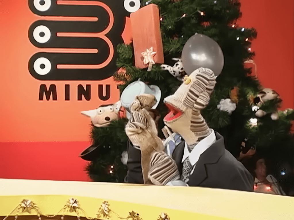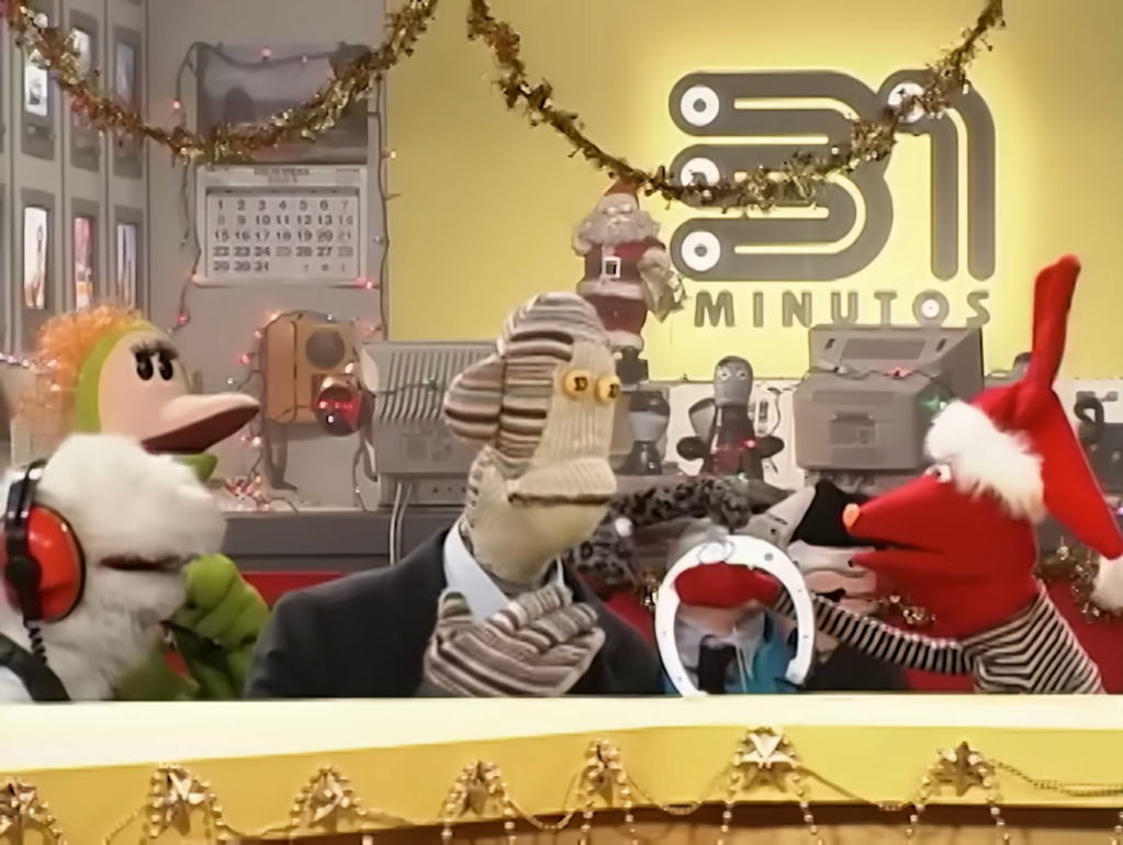 Without further ado, let’s begin this exploration with a summary of the episode: Tulio Triviño, the narcissistic news anchor of 31 Minutos, is reminded by his boss that he cannot go home on Christmas Eve, since it is one of his contractual obligations to lead the channel’s Christmas special. If he stays, all the members of the crew must too. In a hurry, all the puppets decorate the studio and plan the programme. However, due to the rush and the lack of resources, everything is a mess: the tree is caught on fire by an unsafe electrical connection; the presents are lost by Bodoque while betting for “Tormenta China”, a racehorse that NEVER wins; the usual tree baubles are replaced by a plunger, someone’s grandma, a belly-button fluff and even a porta-potty; among others. Somehow, they manage to keep the festive spirit alive among the chaos and enjoy each other’s company.